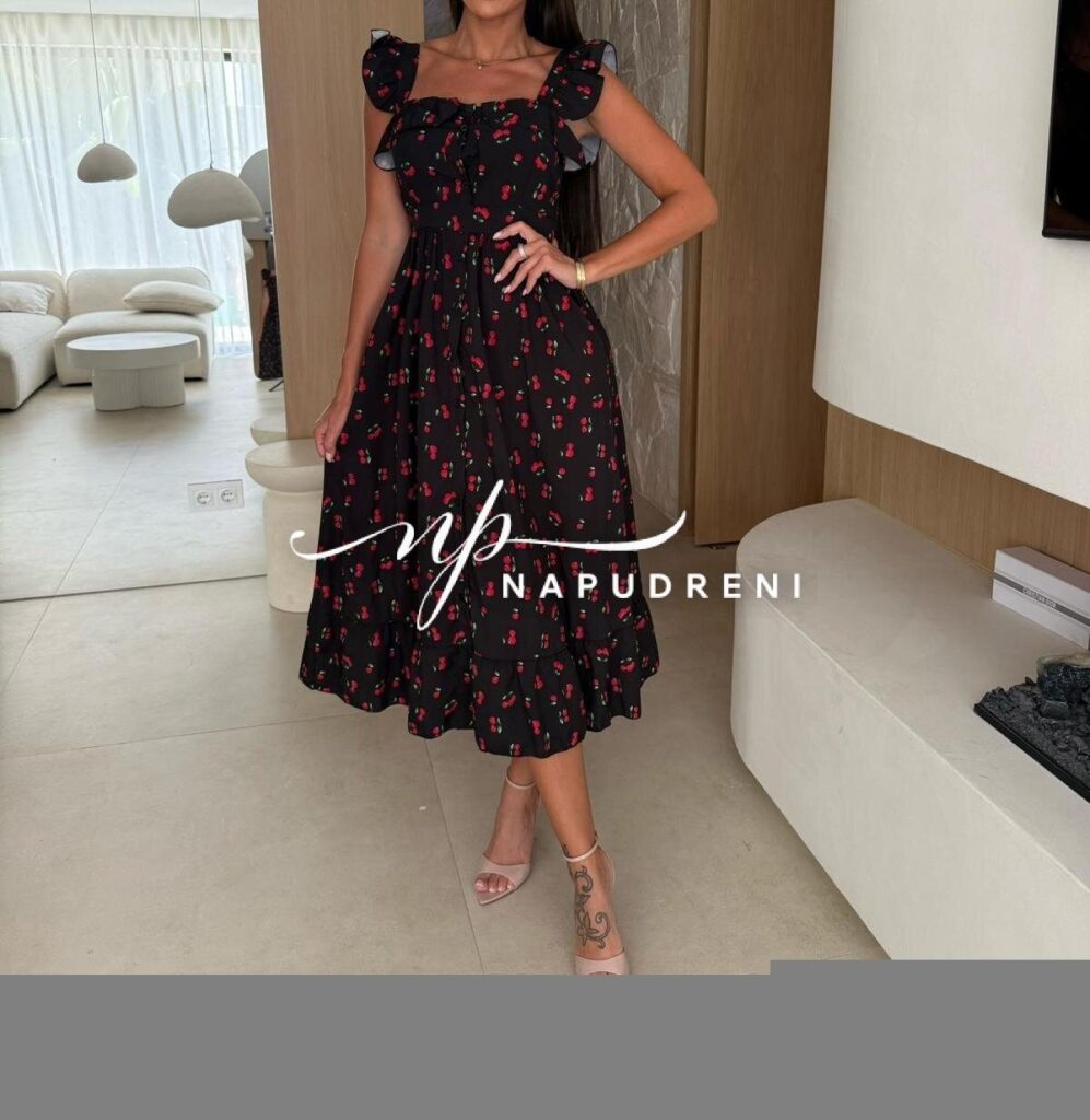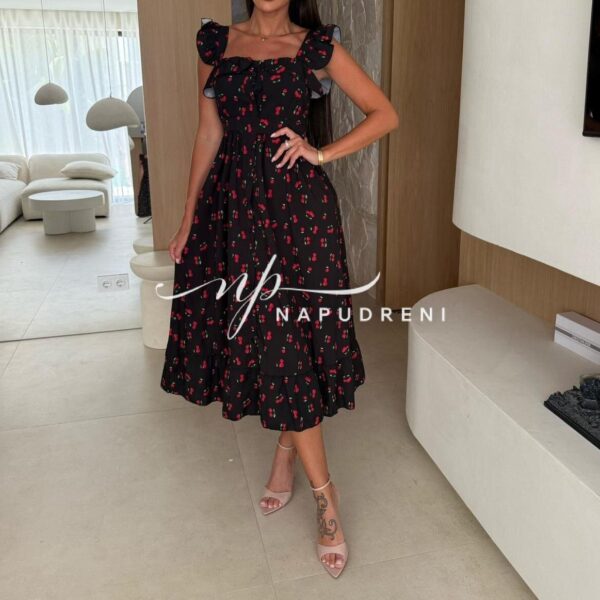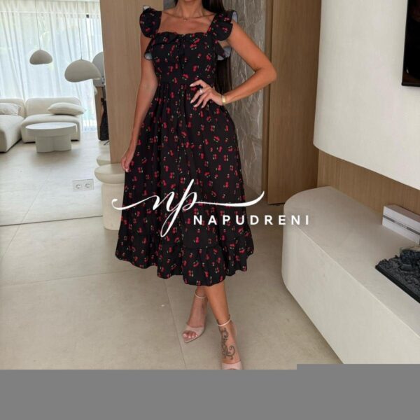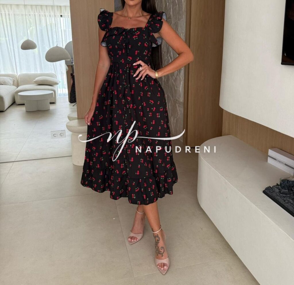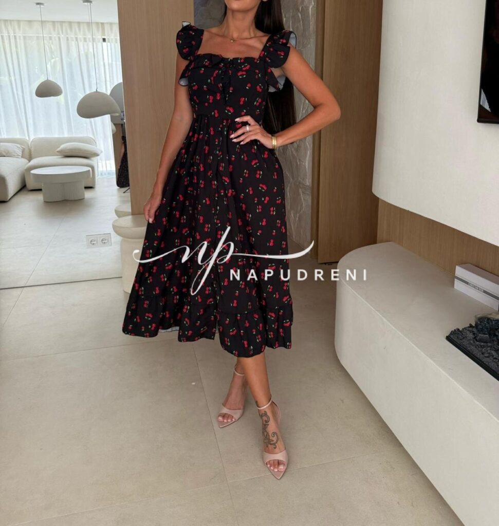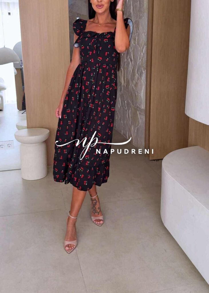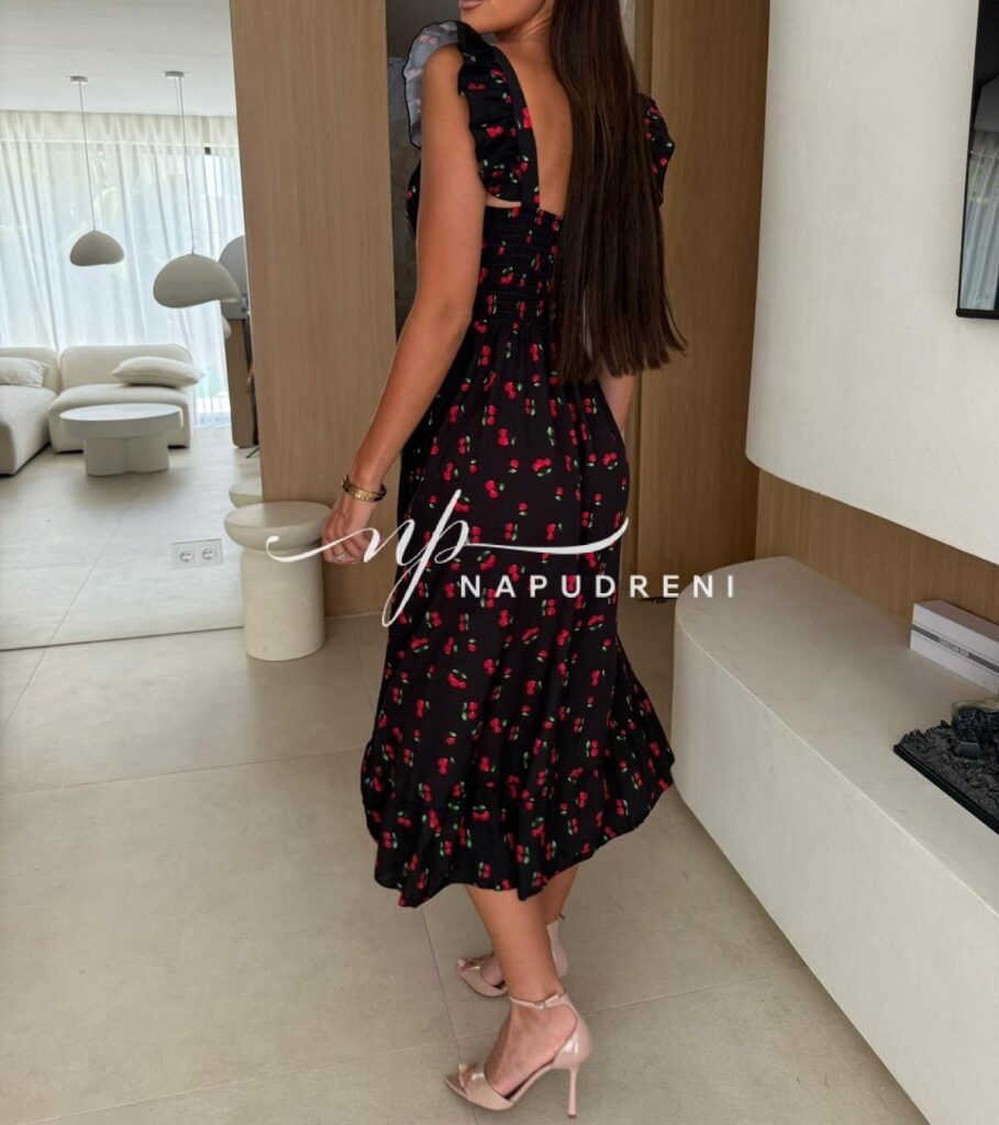 Дълга рокля “Diossa“ с череши в черен цвят – код BL9487