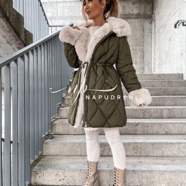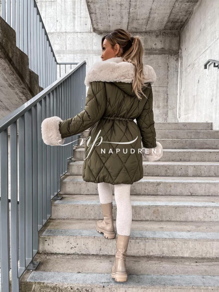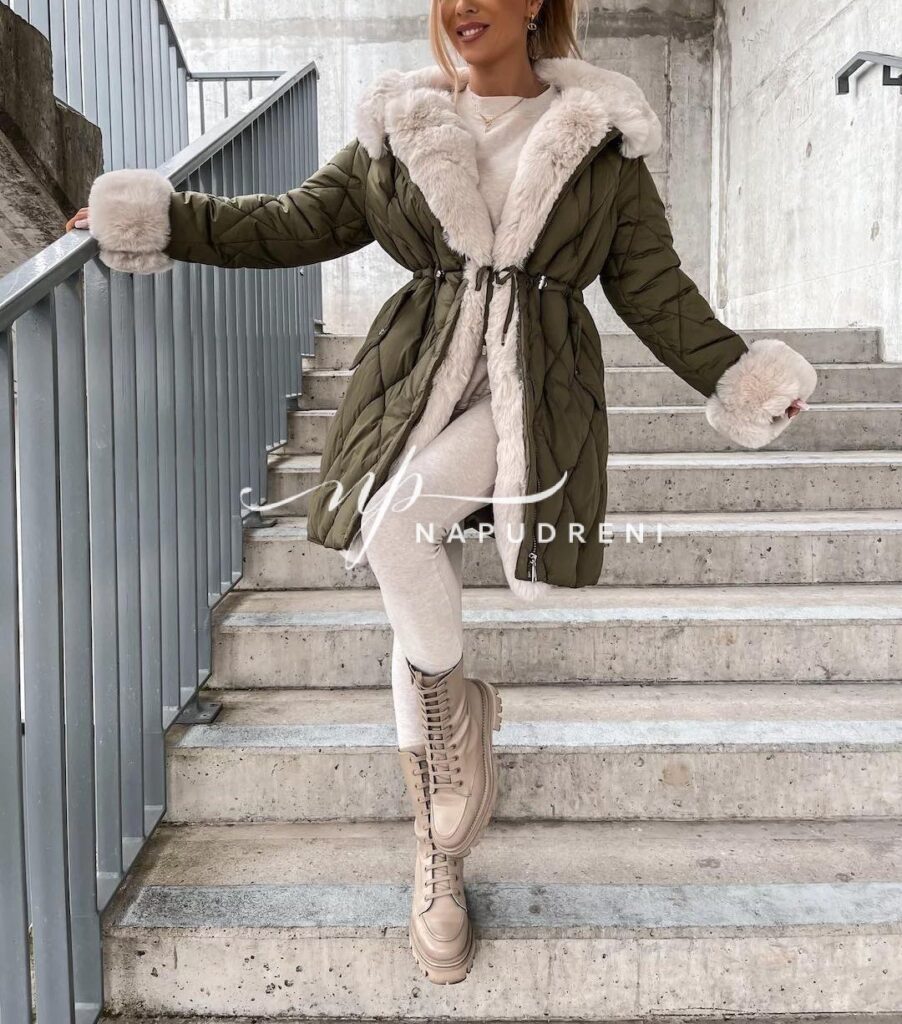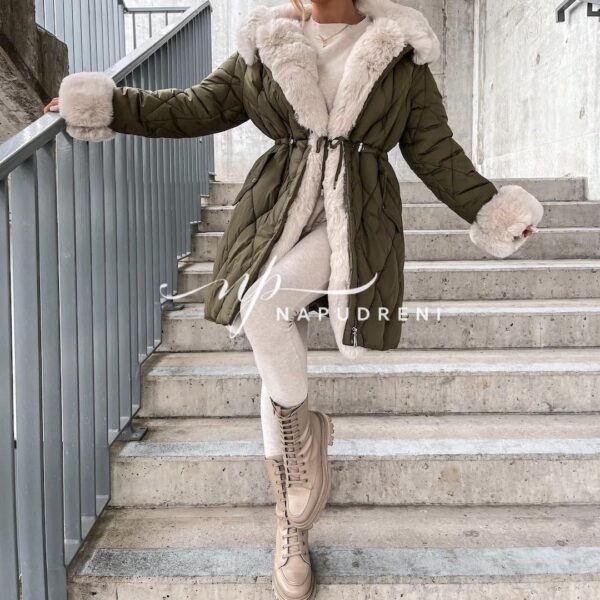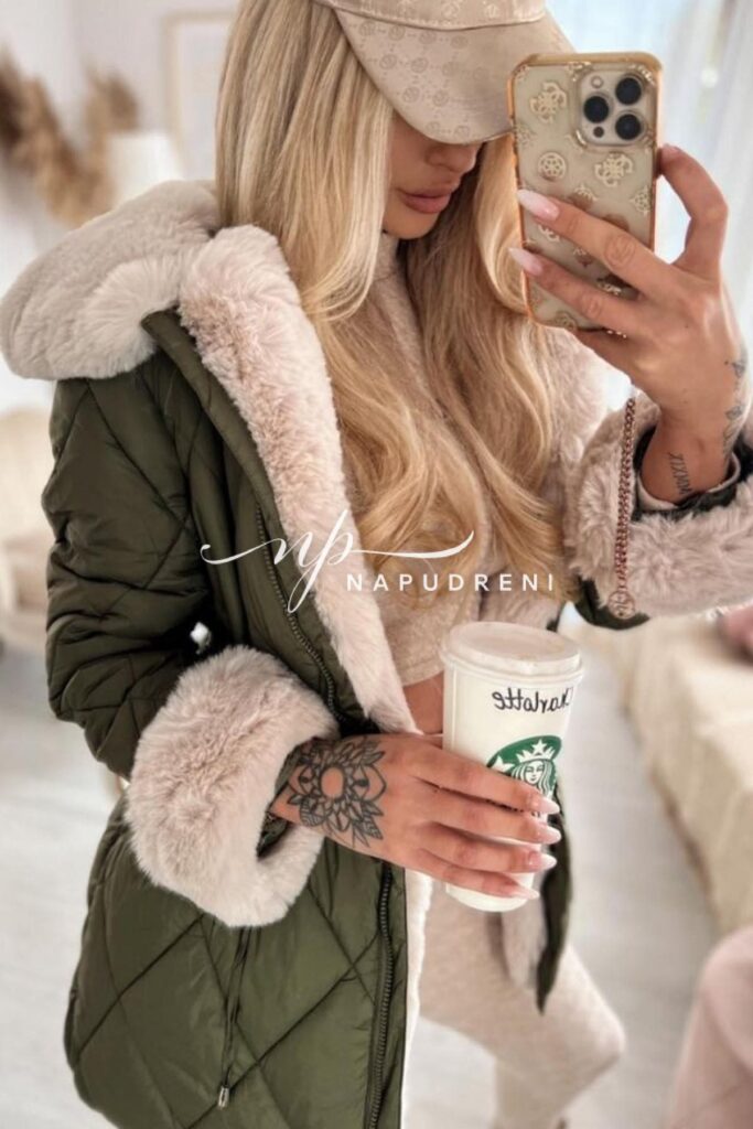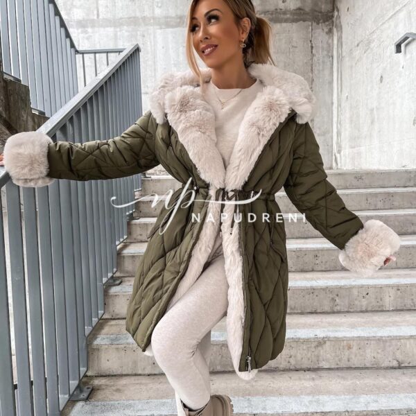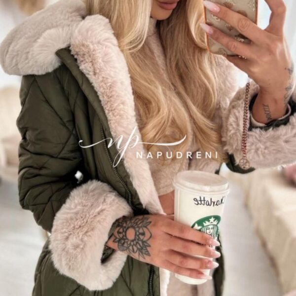 Дълго яке с бежов пух в зелен цвят – код 8330