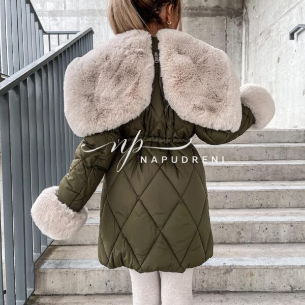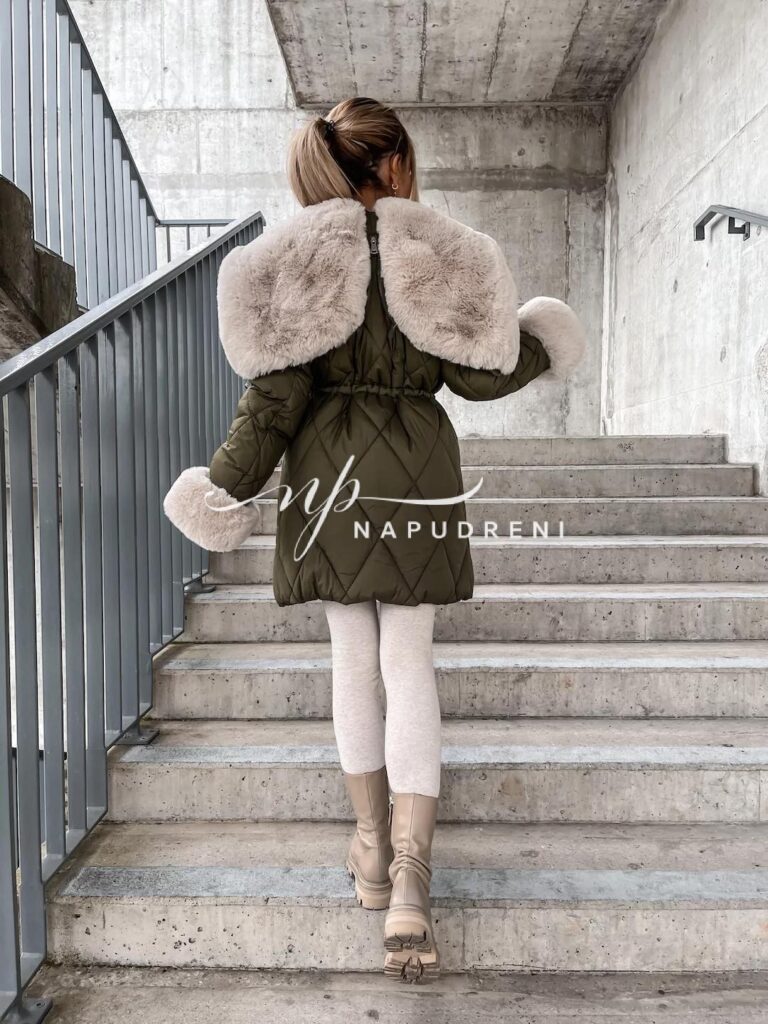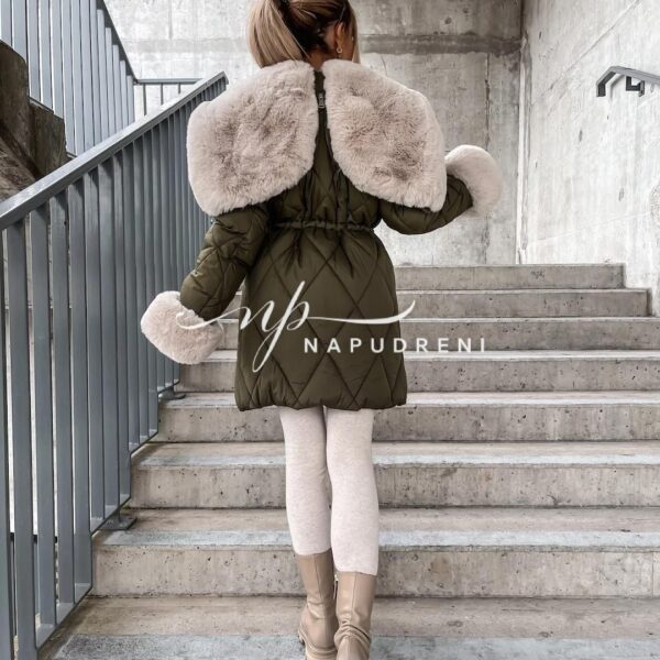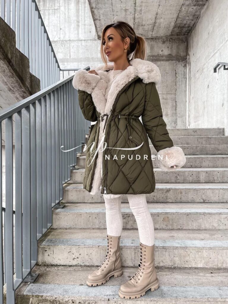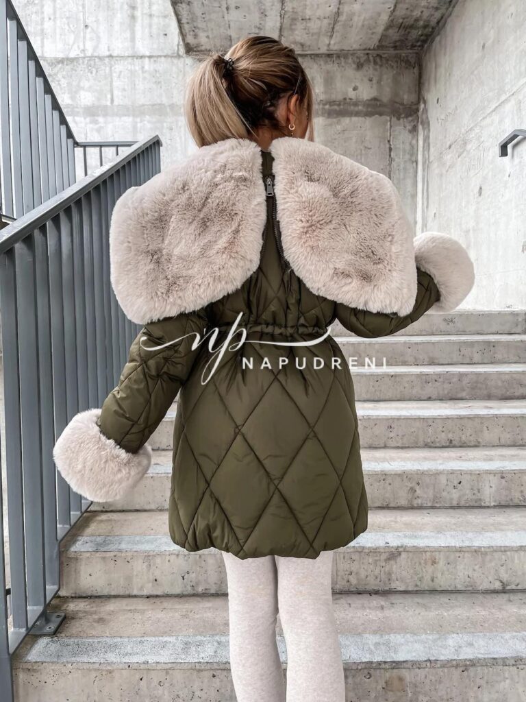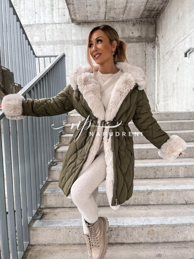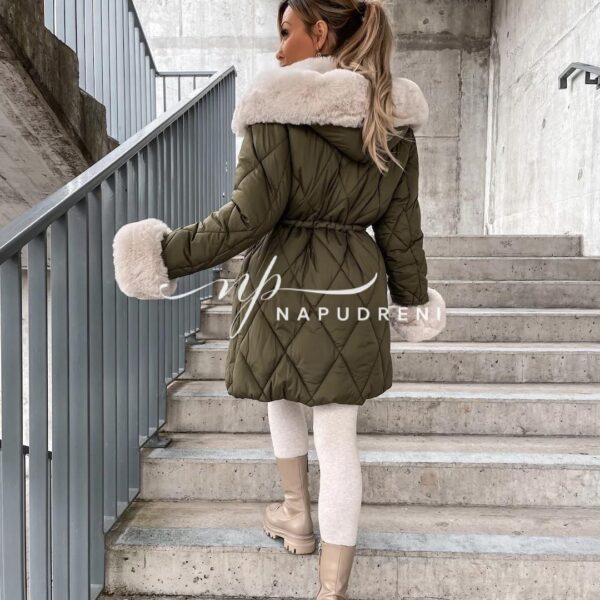Дълго яке с бежов пух в зелен цвят – код 8330