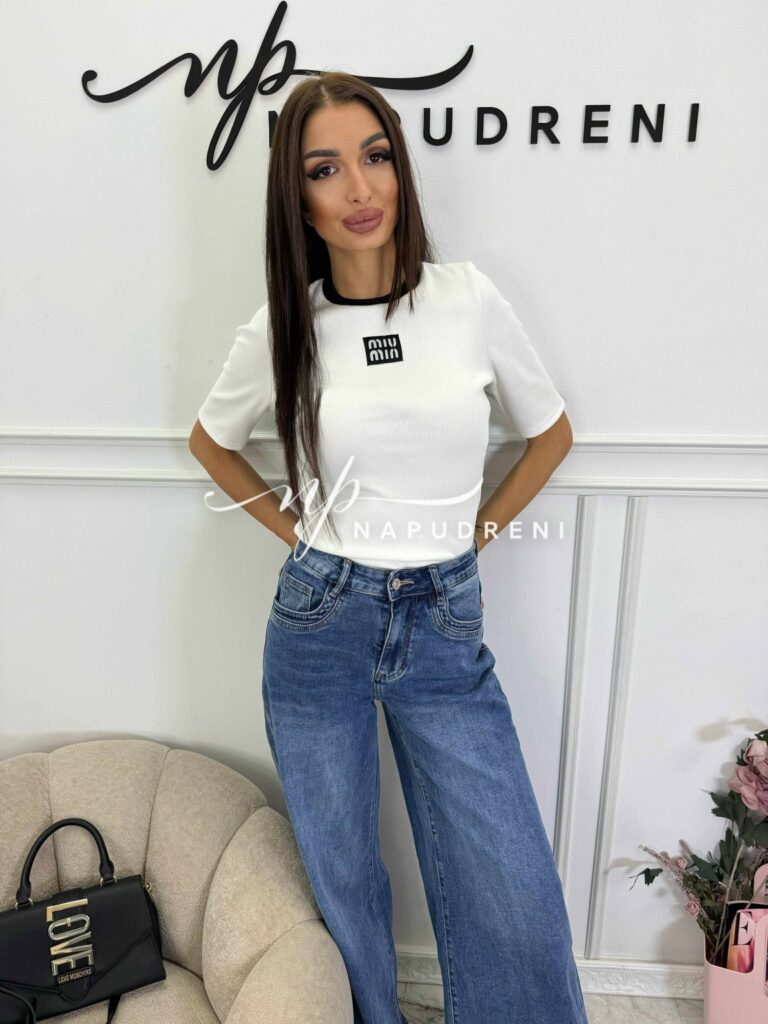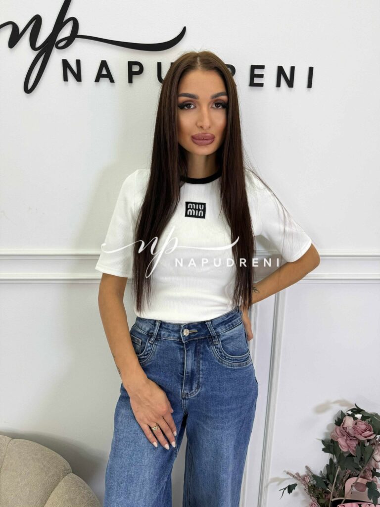 Дамска блуза рипс “MIU“ в бял цвят с черна яка – код BK10018