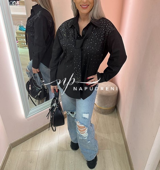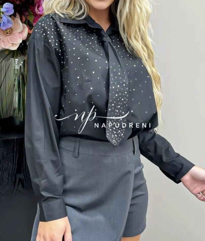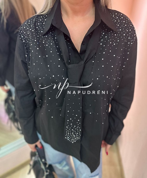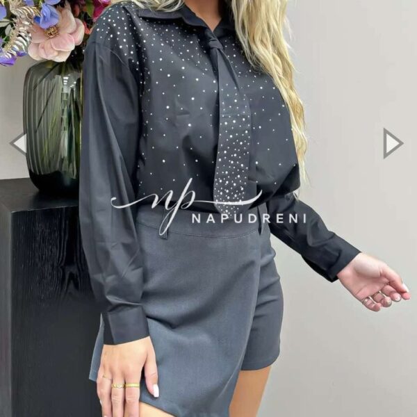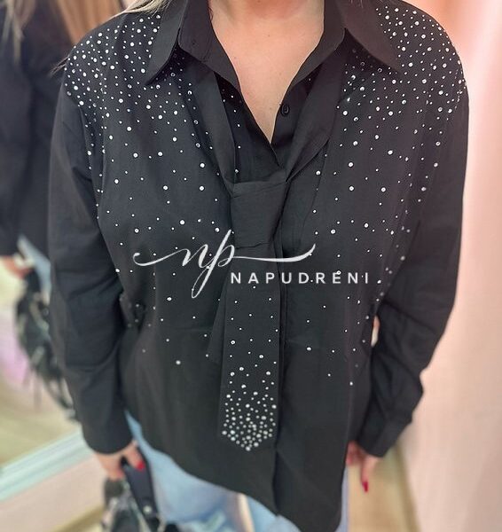 Дамска риза с камъни и вратовръзка в черен цвят – код 8025