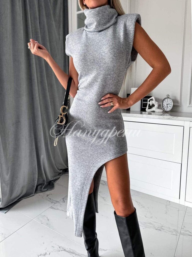 Дамска рокля с асиметрична кройка и поло в сив цвят – код 5963