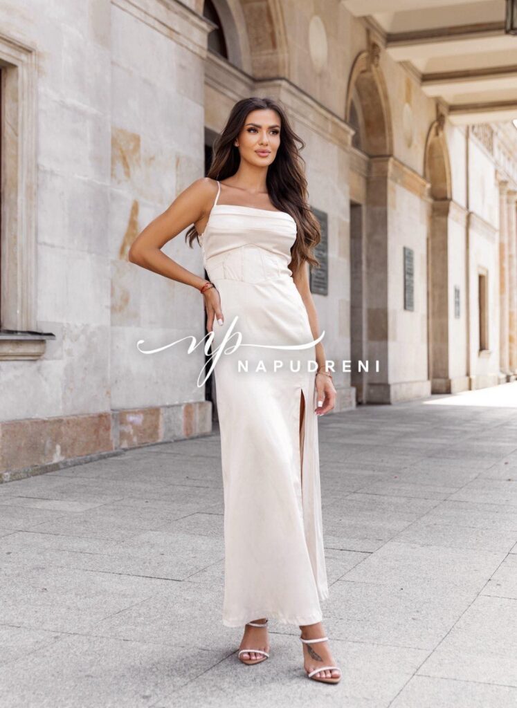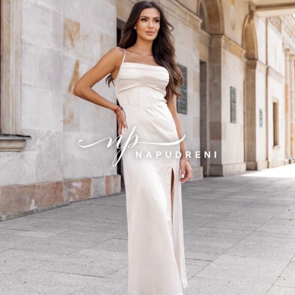 Дамска сатенена рокля “ALEXANDRA“ в бежов цвят – код 7793