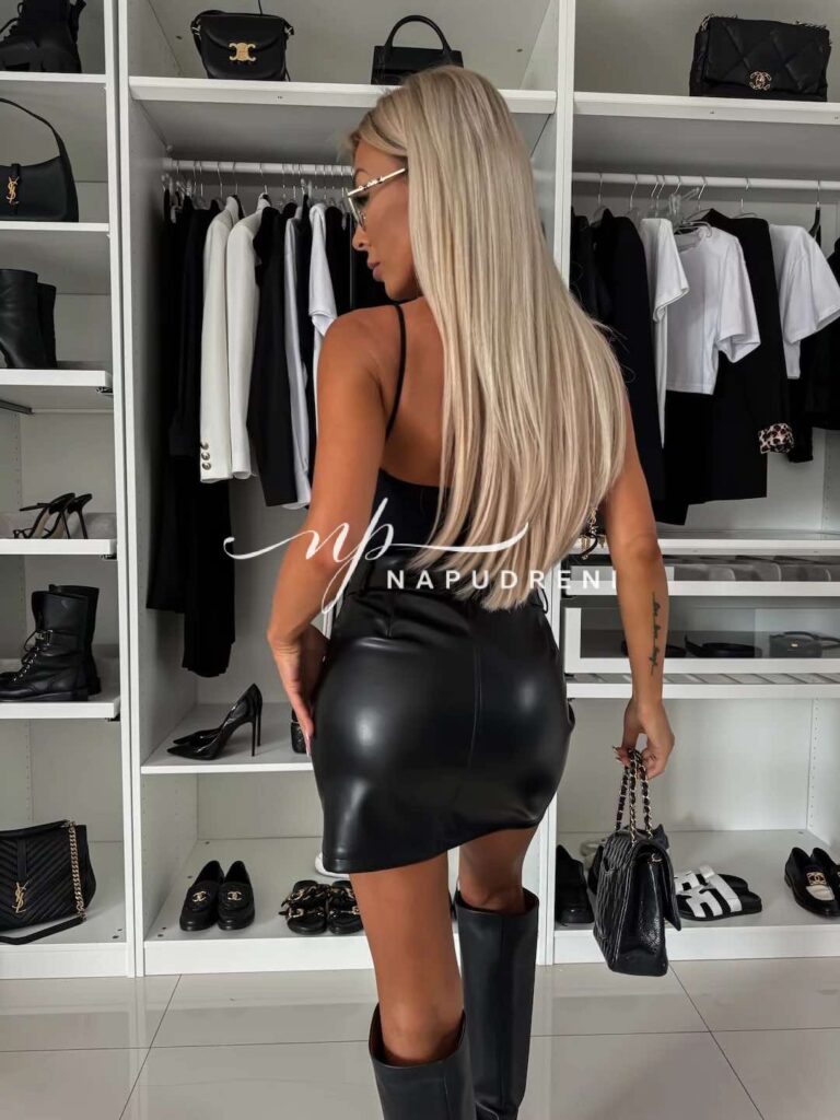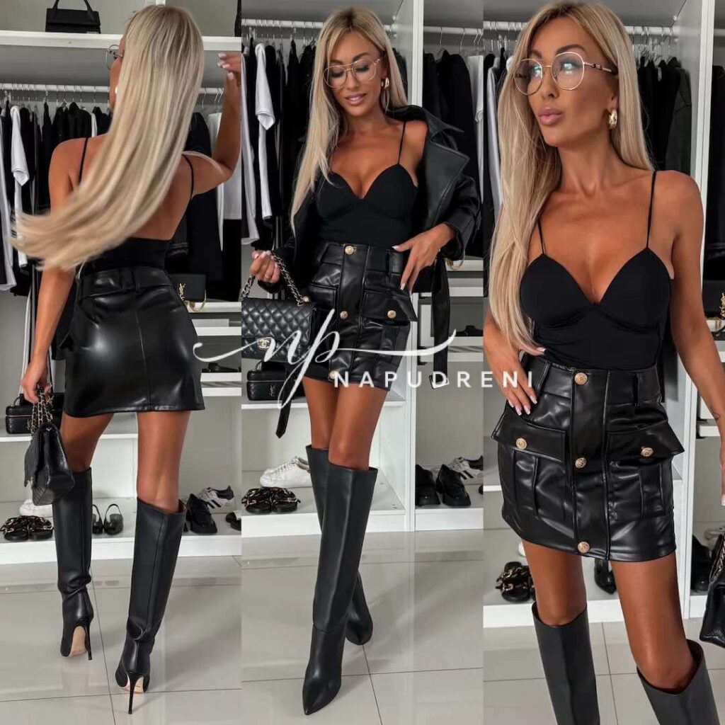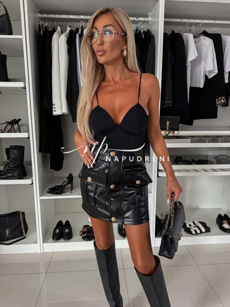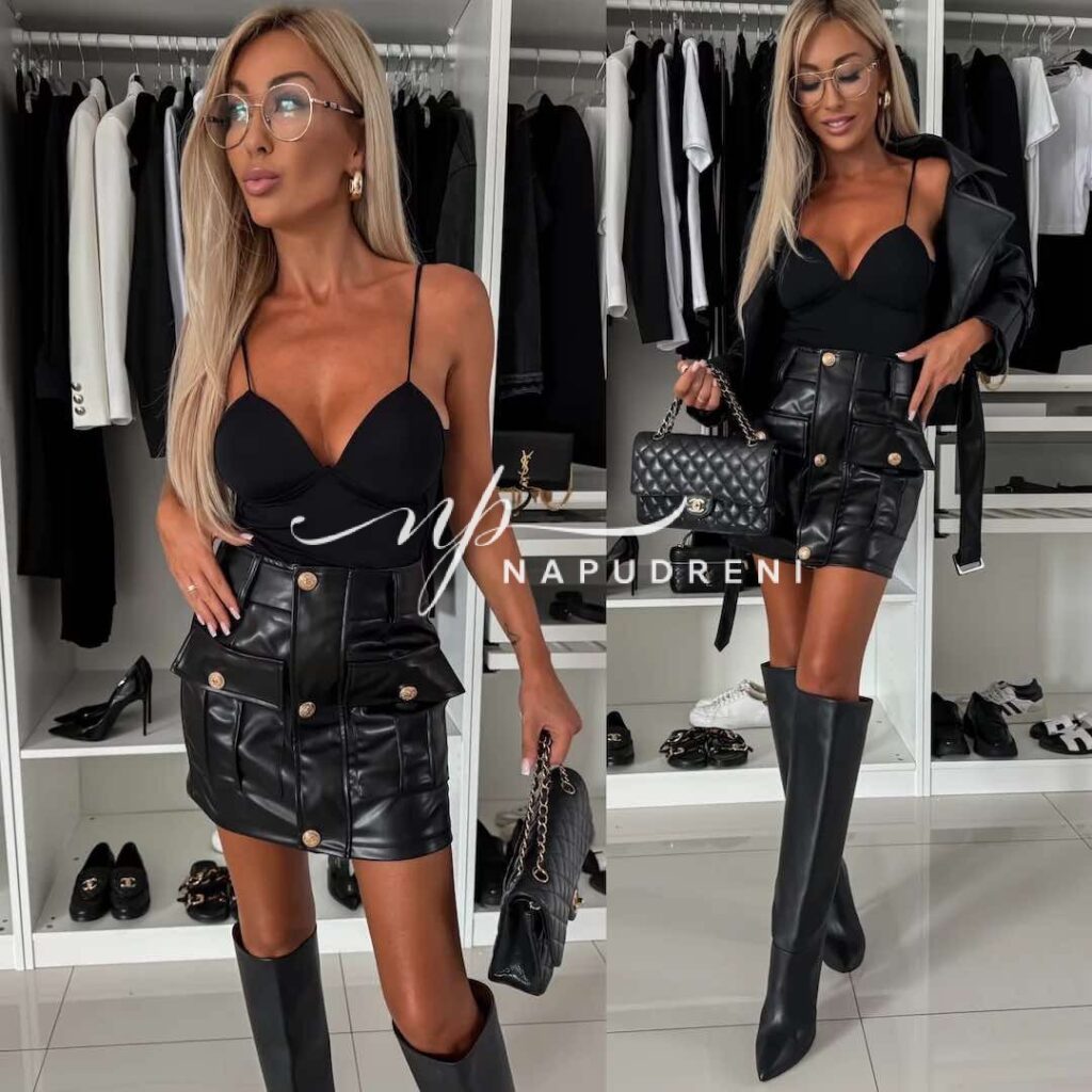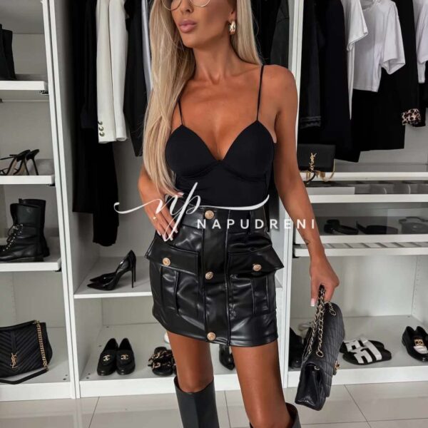 Дамска стилна кожена пола с копчета в черен цвят – код 7944