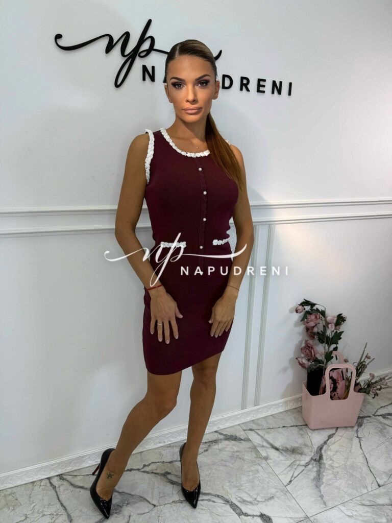 Дамска вталена рокля с бродерия в цвят бордо – код BS9930