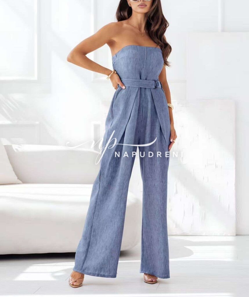 • Дамски дълъг гащеризон с колан в син цвят  - код G9167
