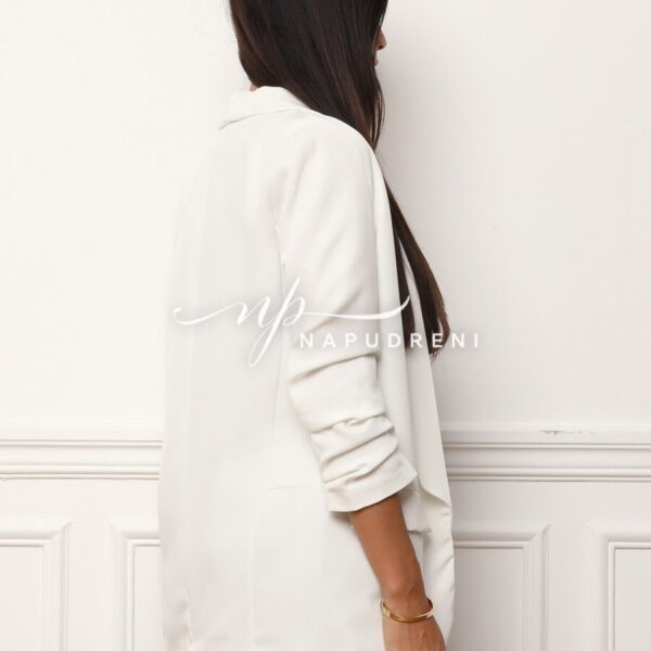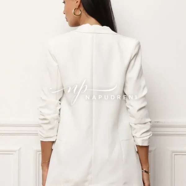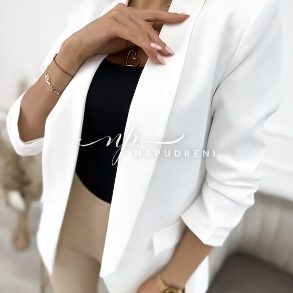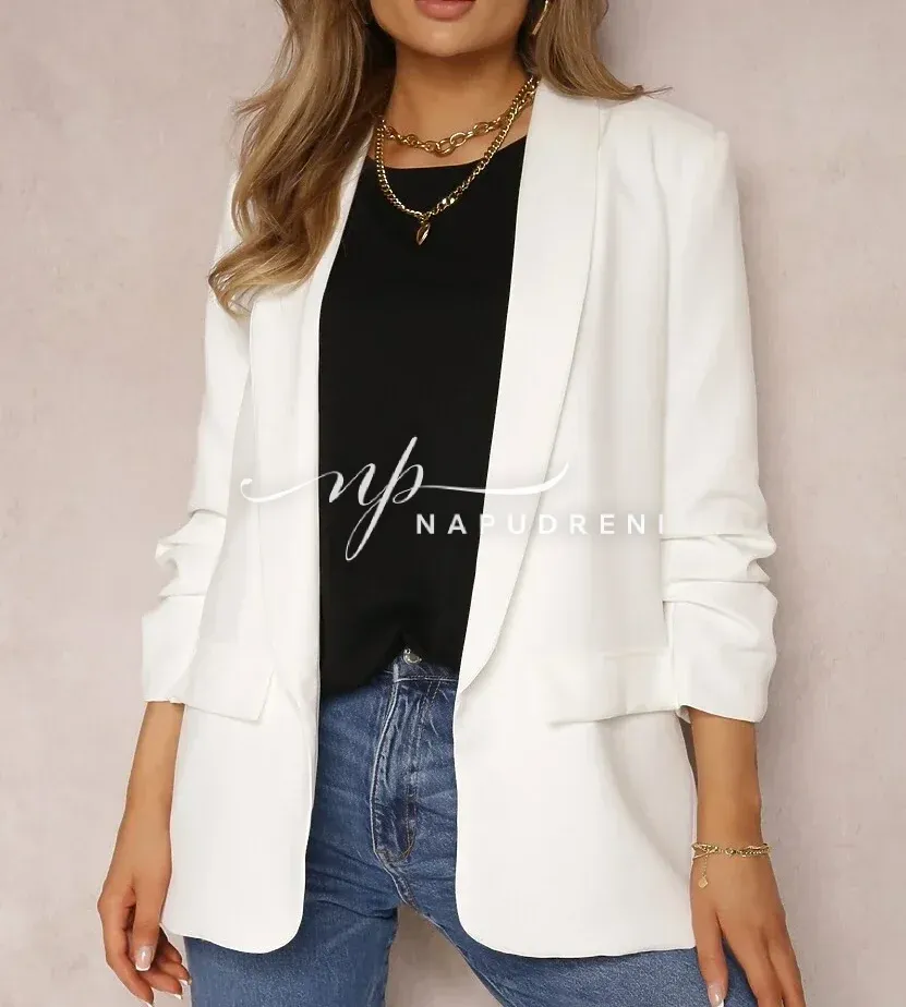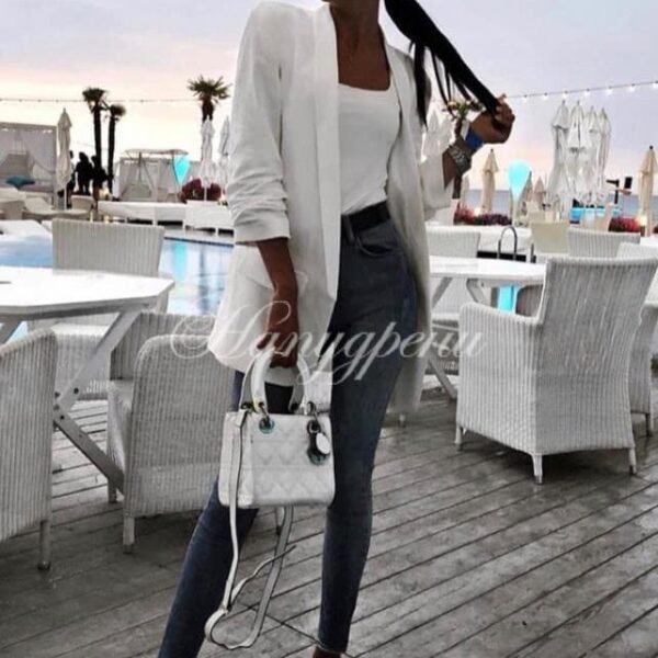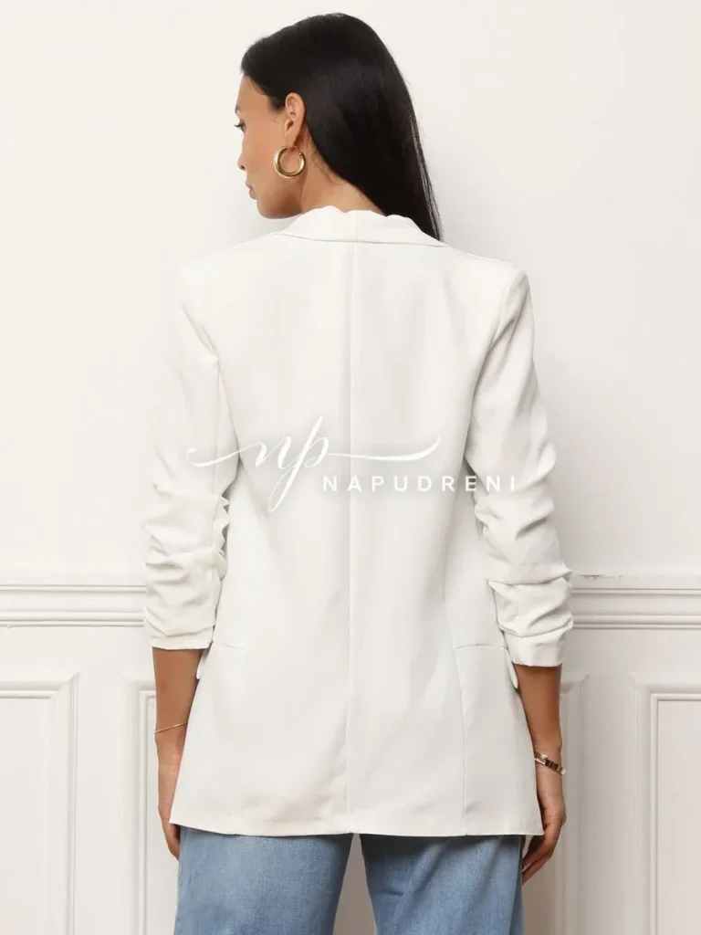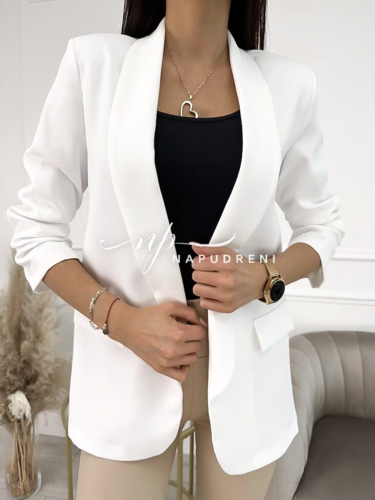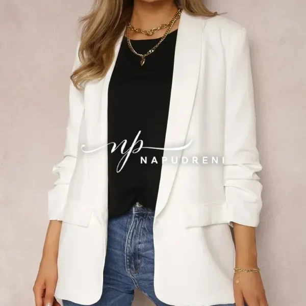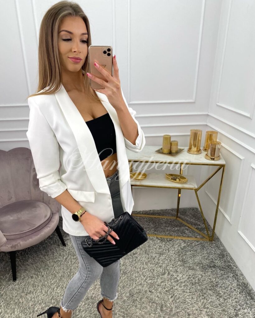 Дамско сако Моделът е с V-образно деколте. Ръкавите са леко набрани, тип 7/8-ми. Изчистен и естетически издържан модел. Сакото е с хастар, което го прави още по-изкушаващо. Лесно се съчетава с различни тоалети, за завършена ежедневна или официална визия.