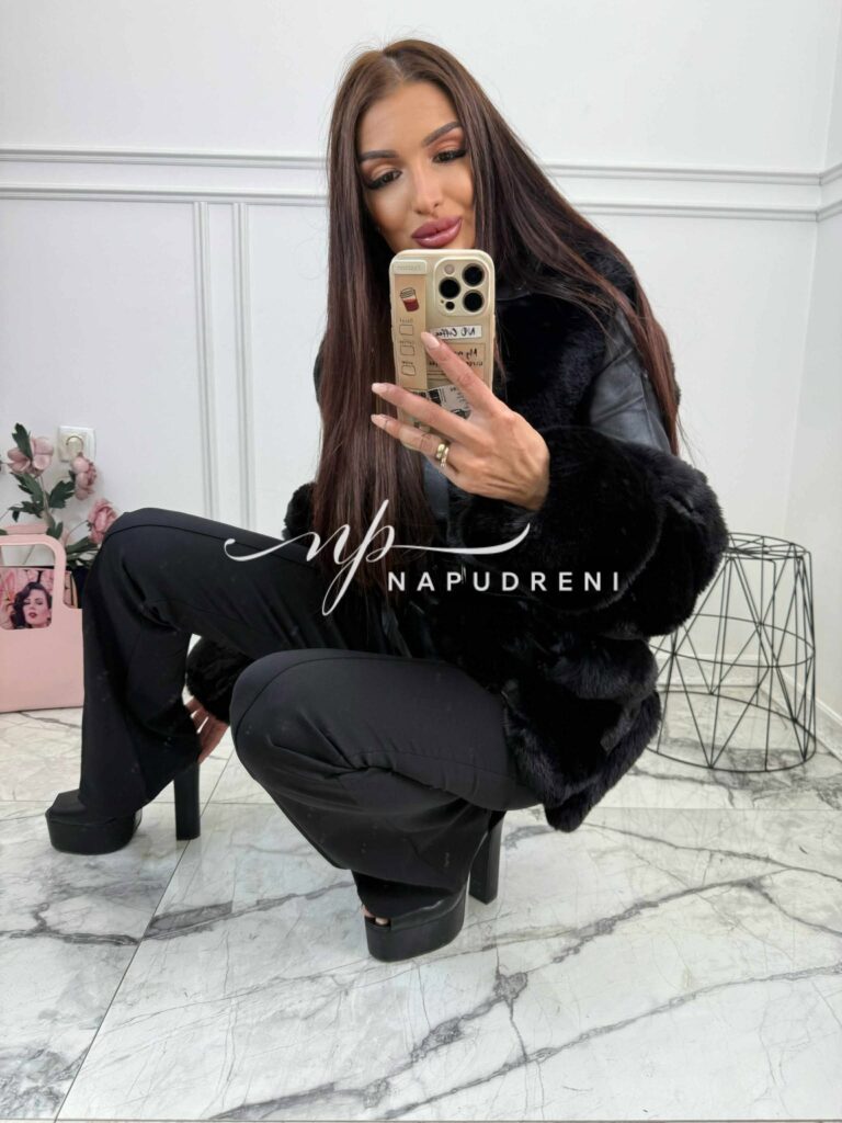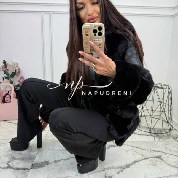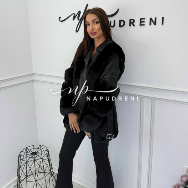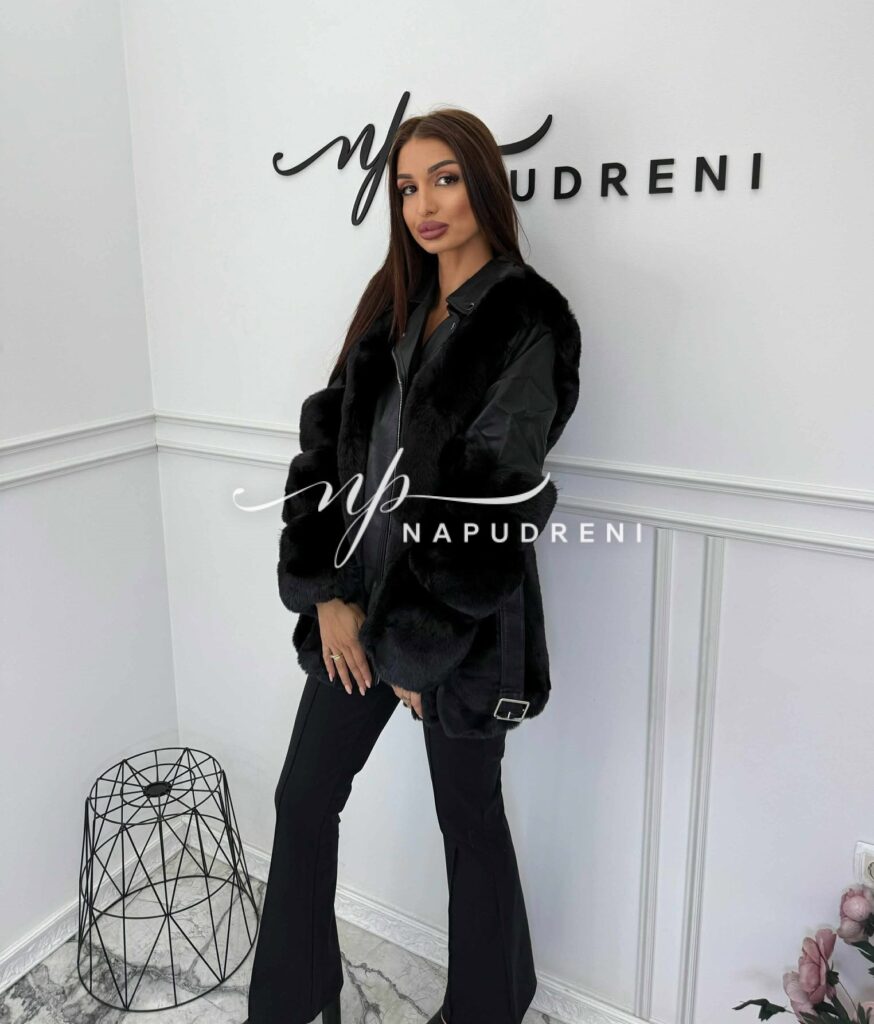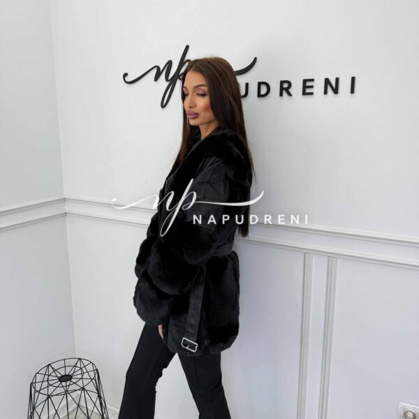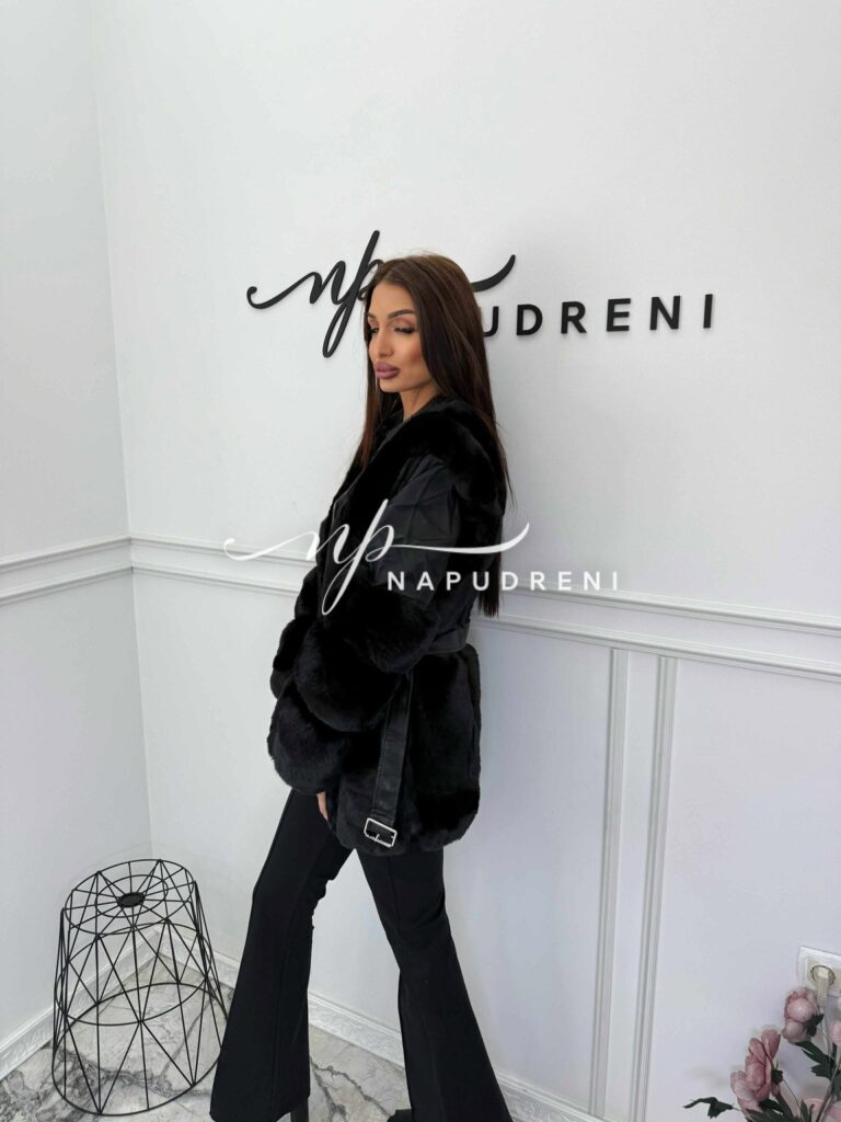 Кожено яке с колан и пух в черен цвят – код BL9893