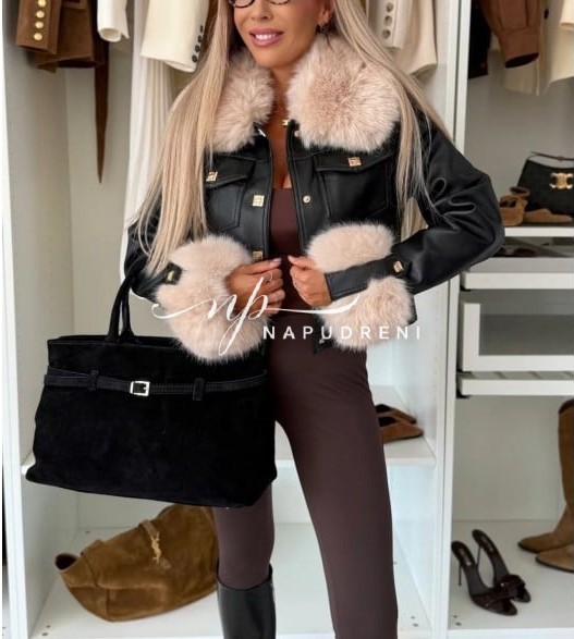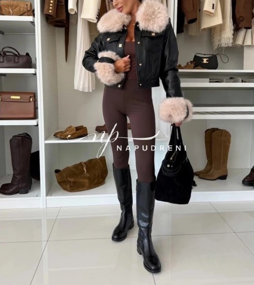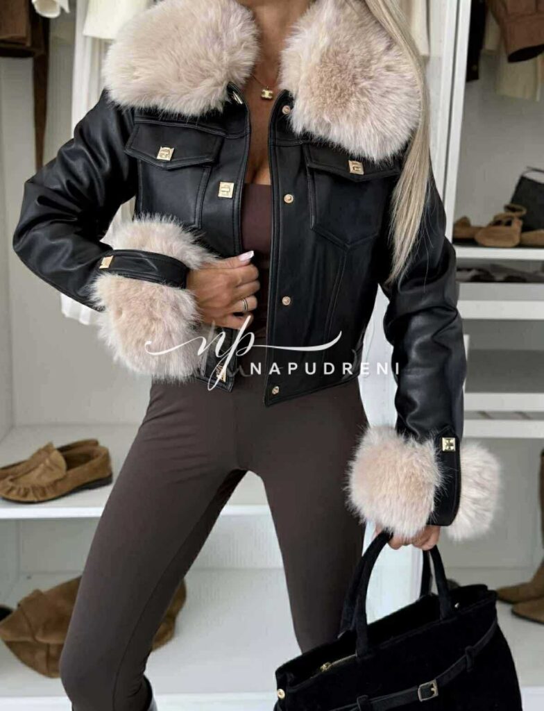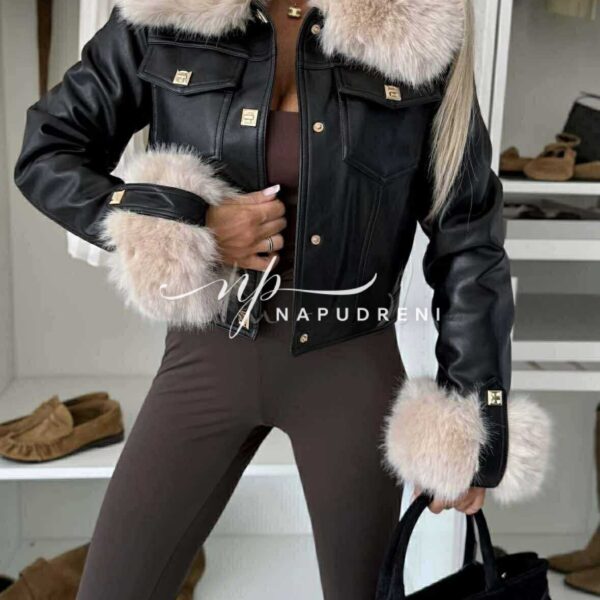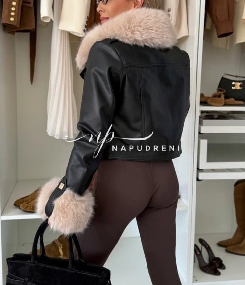 Кожено яке с пух в черен цвят с копчета – код 9995