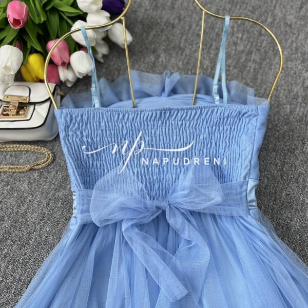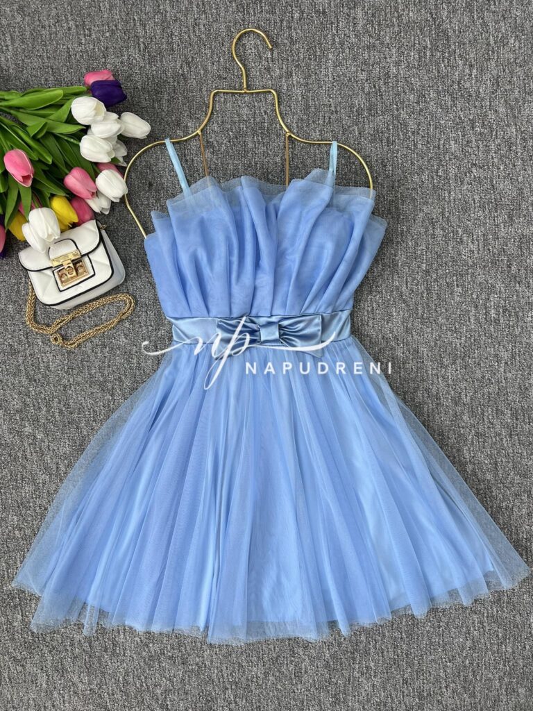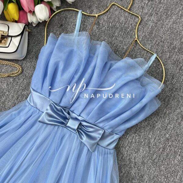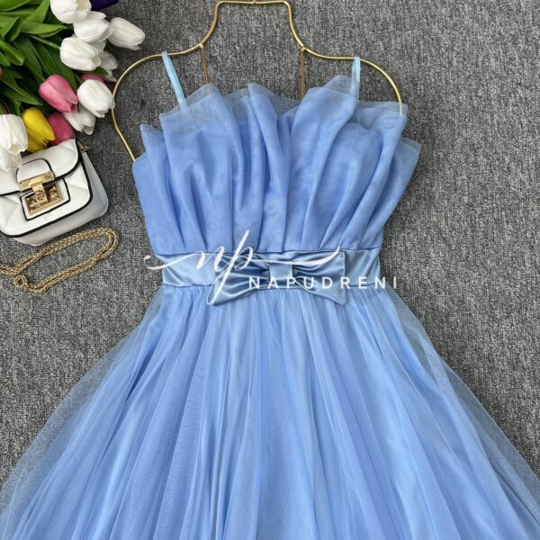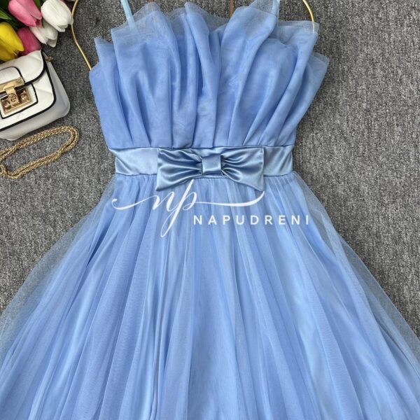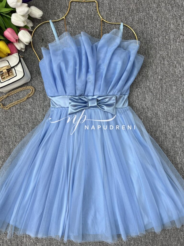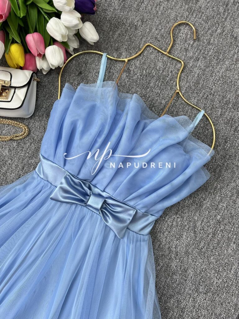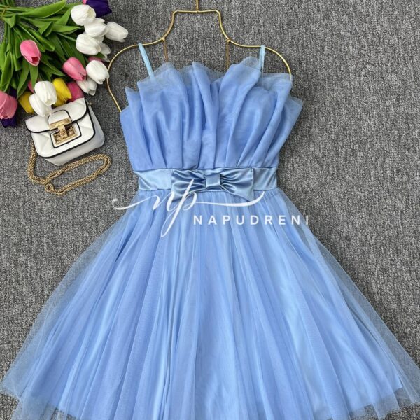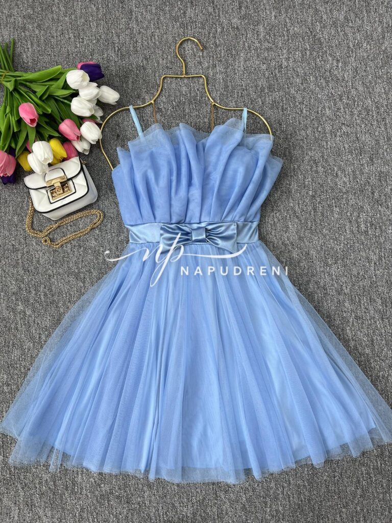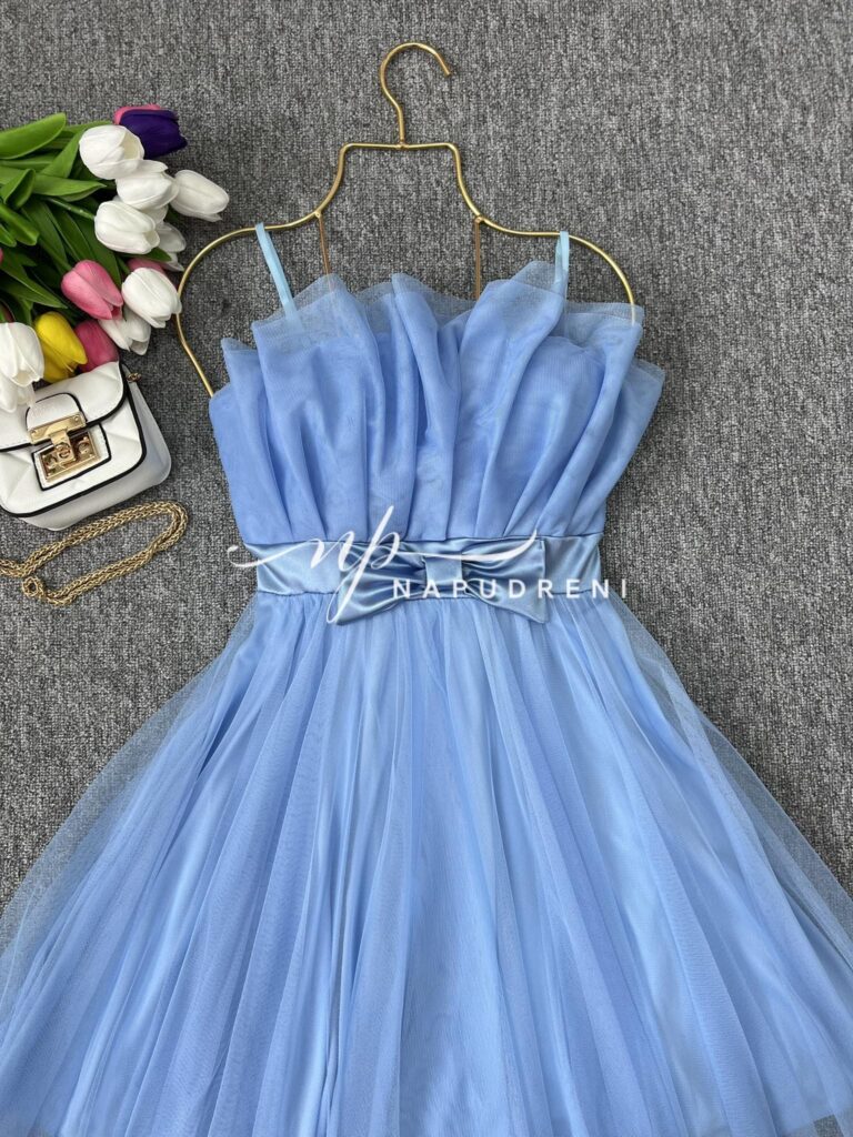 Кокетна дамска рокля с тюл в светлосин цвят – код 7026