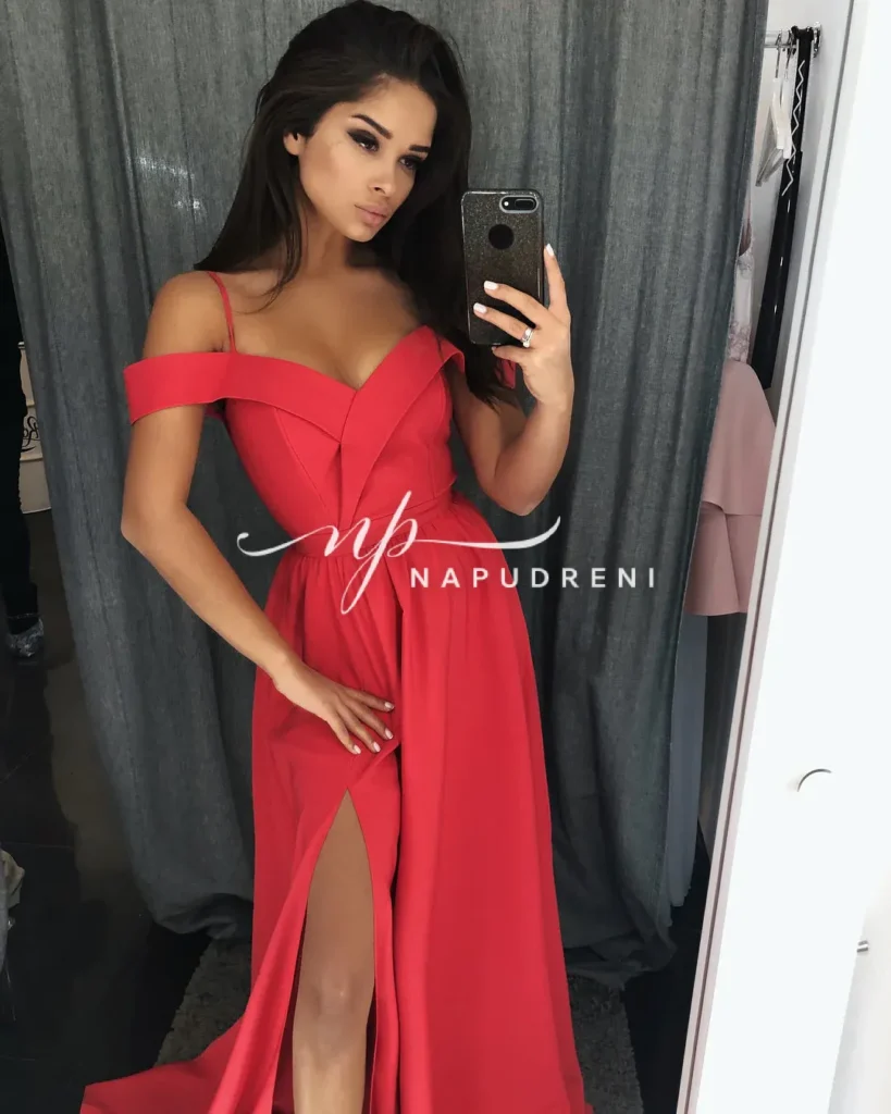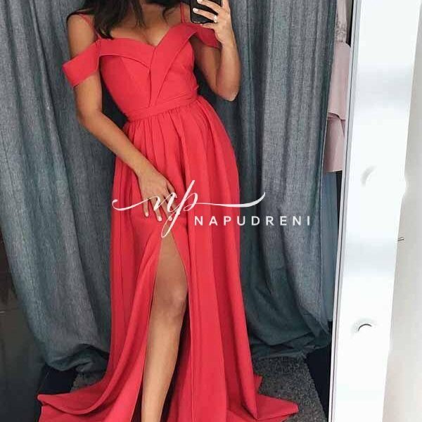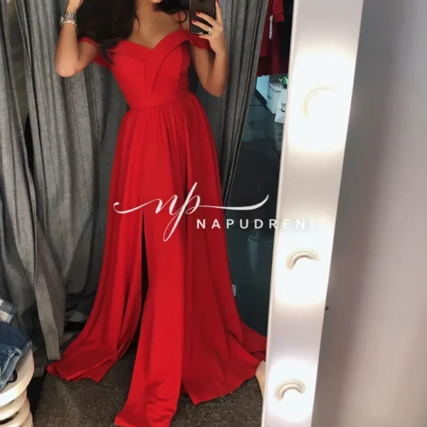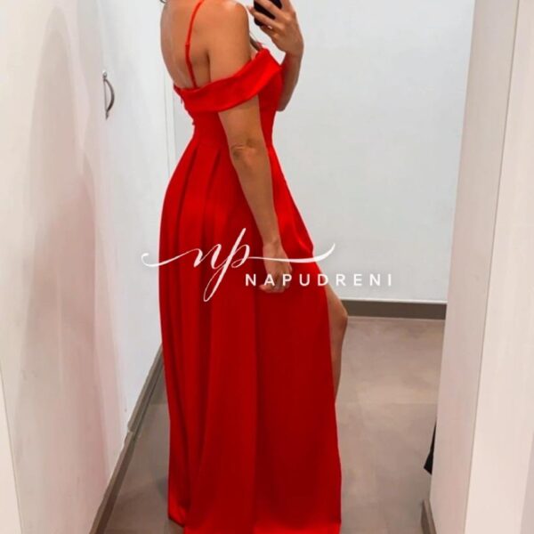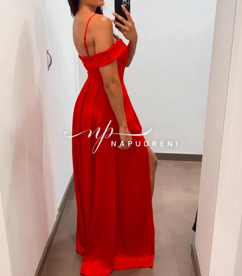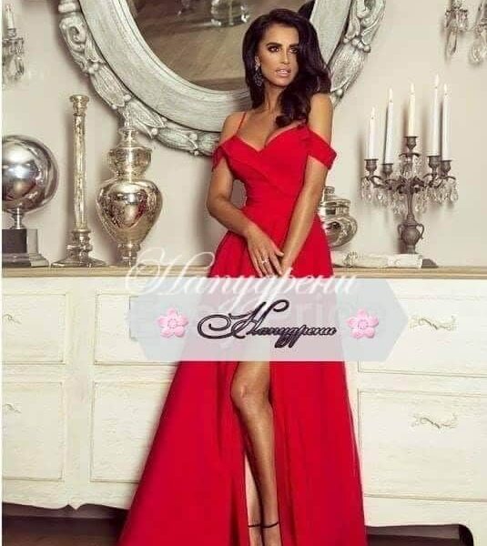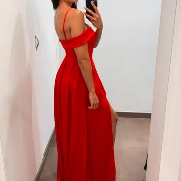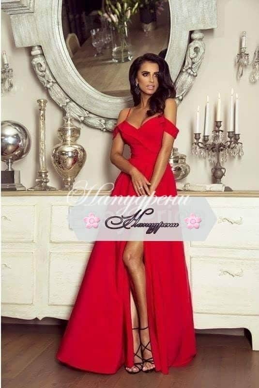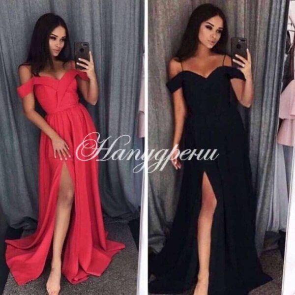 Дамска рокля Моделът е с паднали рамена. От талията надолу се разкроява и пада свободно, като от едната страна има ефектна цепка. Нежен модел, който би бил напълно подходящ за една завършена вечерна или официална визия.