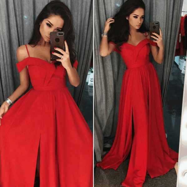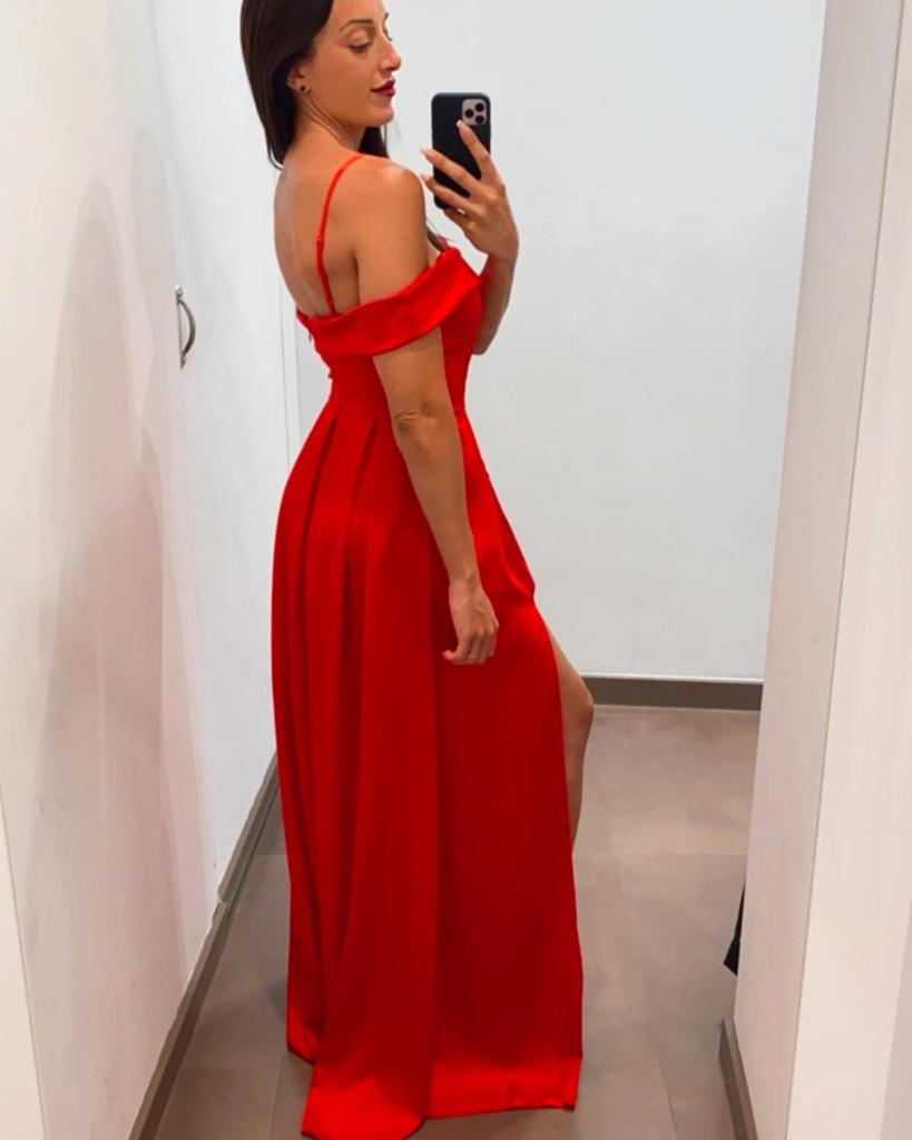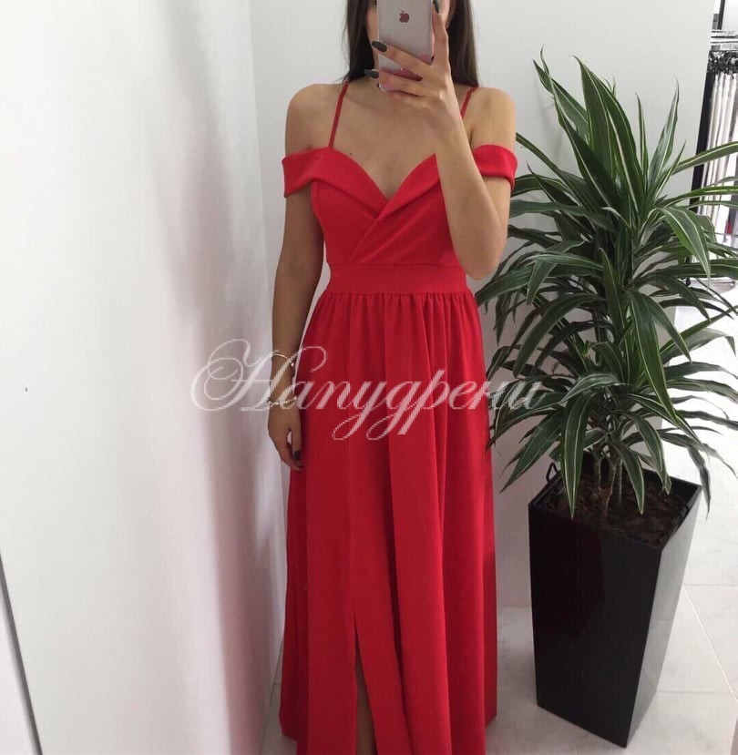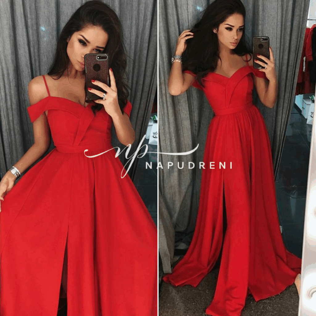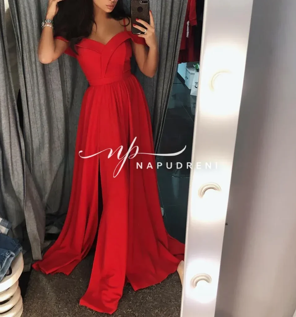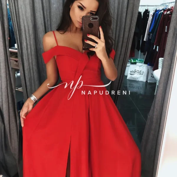 Дамска рокля Моделът е с паднали рамена. От талията надолу се разкроява и пада свободно, като от едната страна има ефектна цепка. Нежен модел, който би бил напълно подходящ за една завършена вечерна или официална визия.