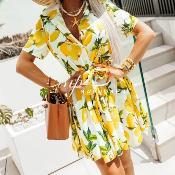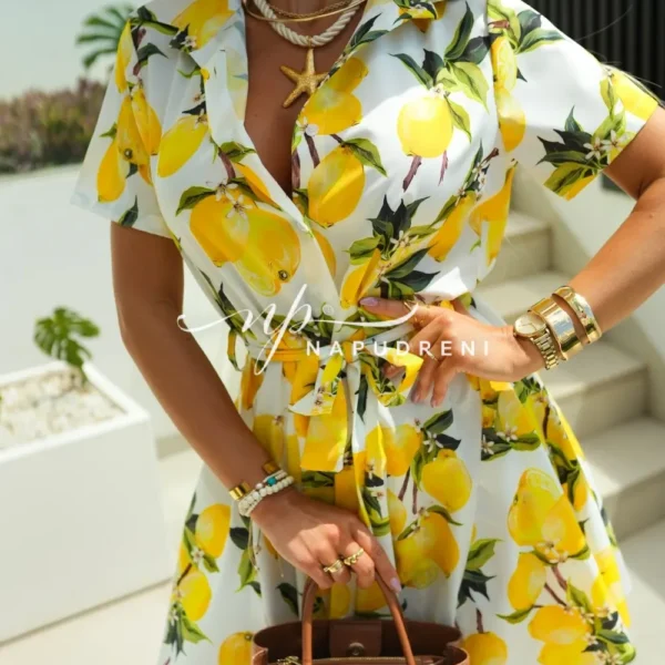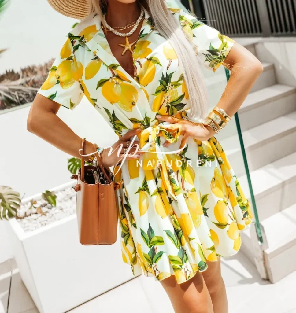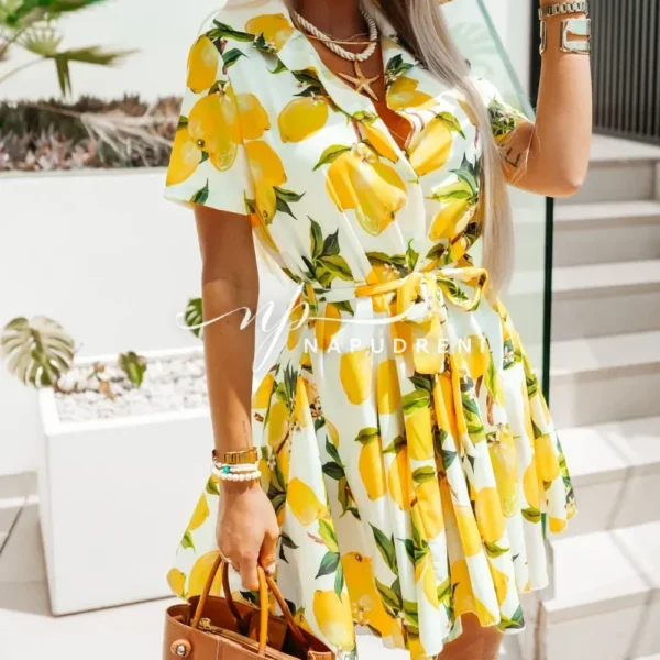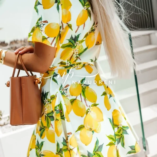 Рокля-риза с колан в бял цвят и лимонов принт – код G9655