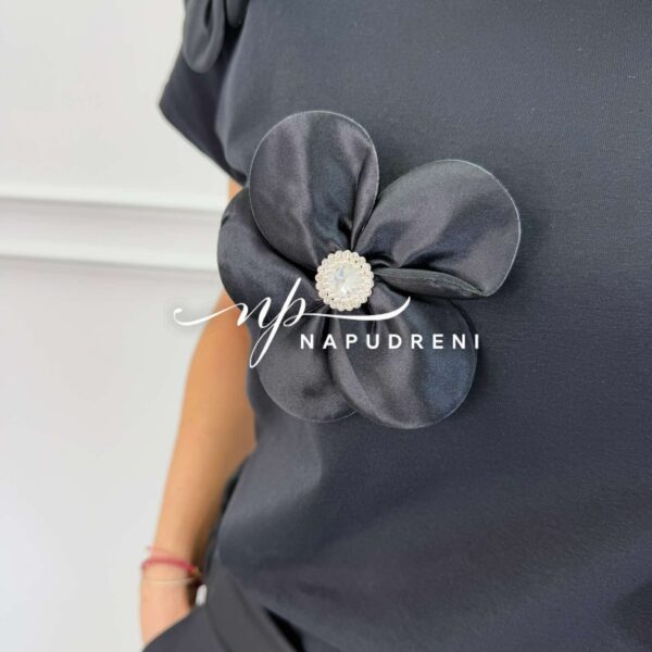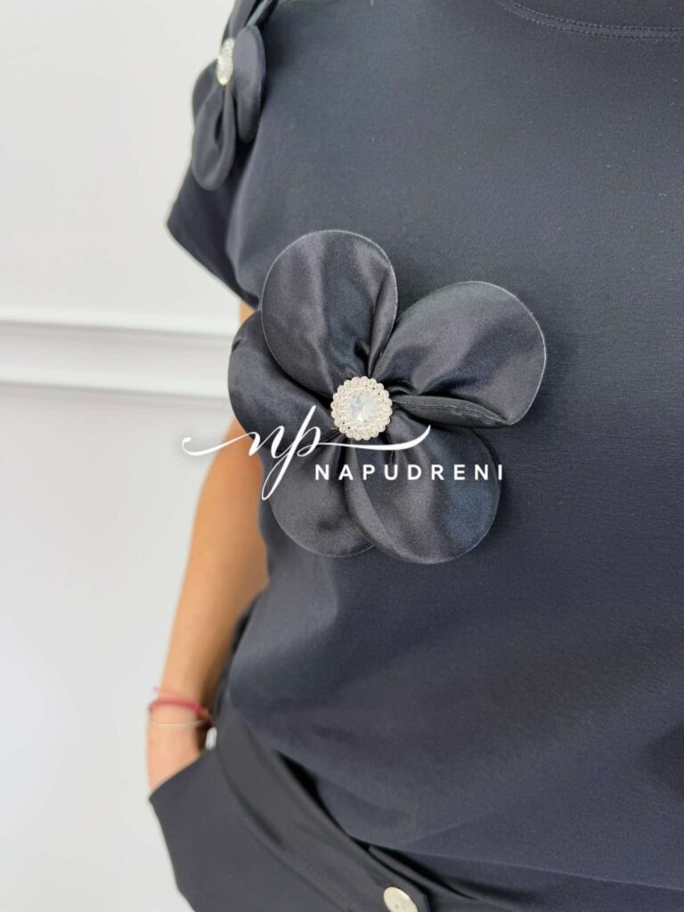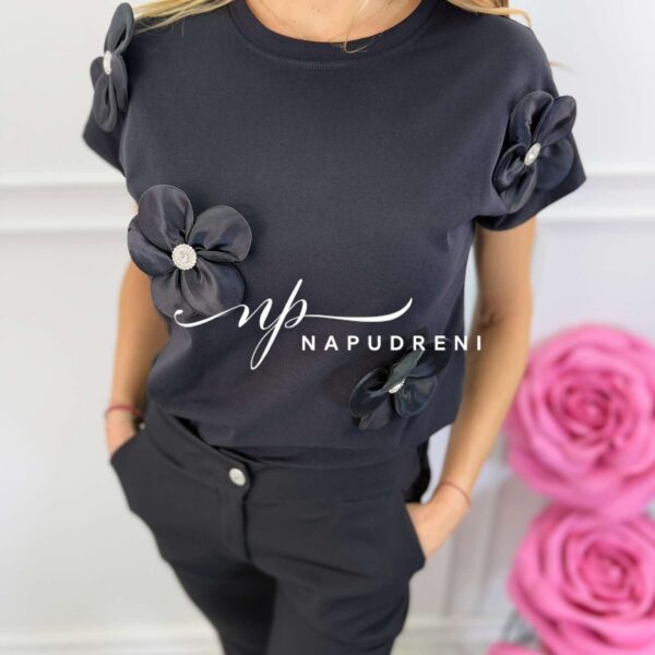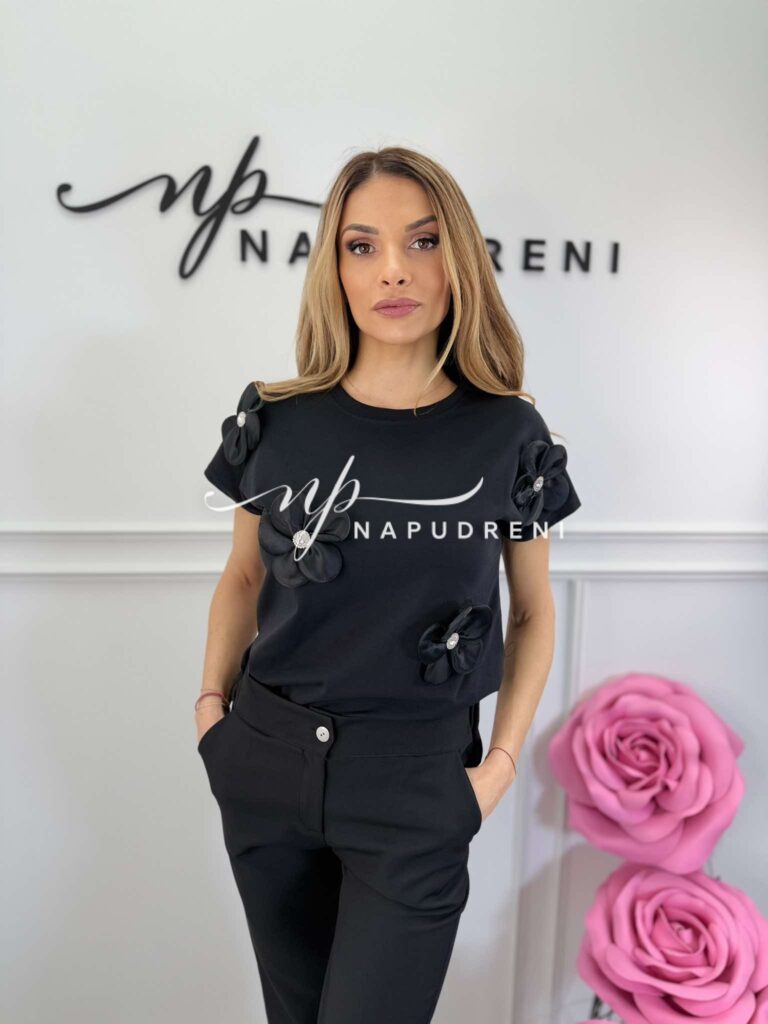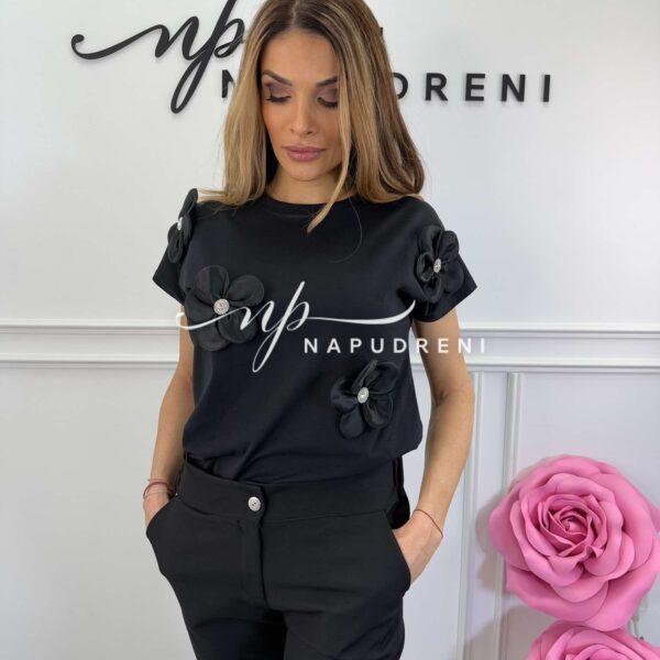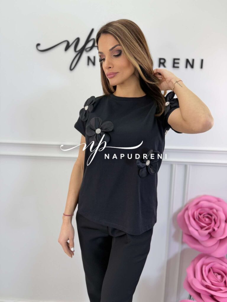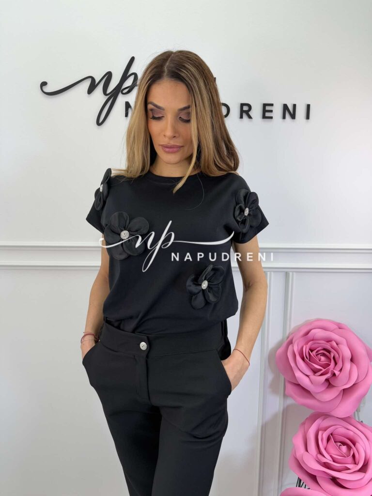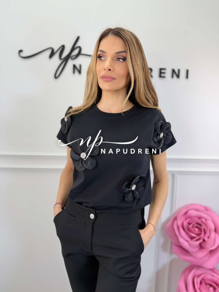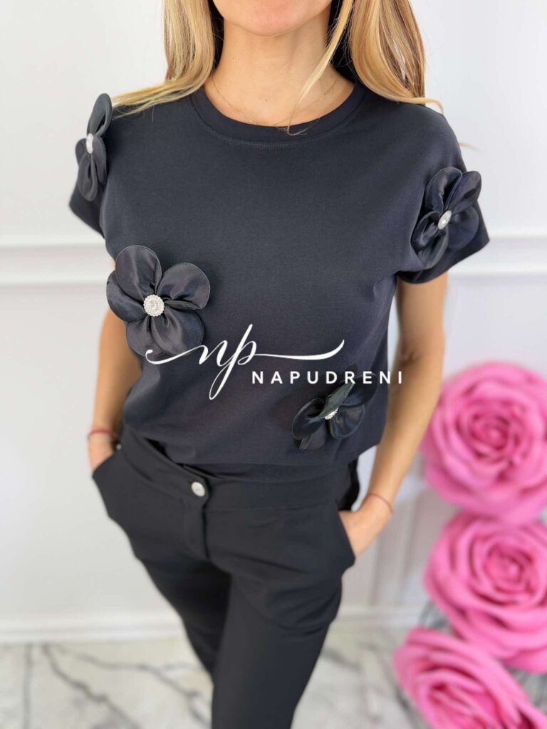Стилна тениска с 3Д черни цветя в черен цвят – код 8750