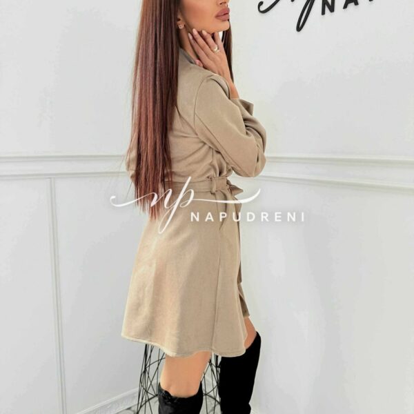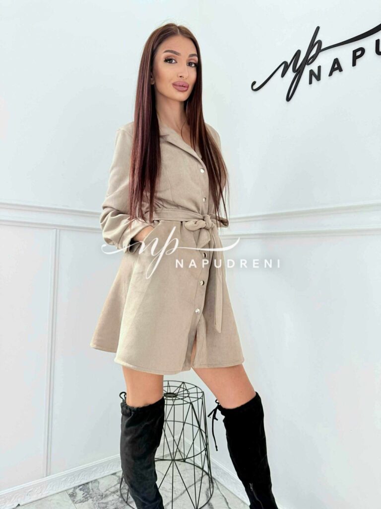 Велурена рокля с копчета и колан в бежов цвят – код G9898